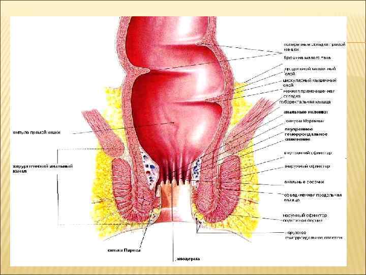 Толстый кишечник (воспаление - колит) Функции: 1. всасывание воды и мин. солей 2. формирование и выведение каловых масс Отличия толстого кишечника от тонкого: 1. слизистая не имеет ворсинок и образует полулунные складки 2. продольные мышечные волокна собраны в 3 продольные мышечные ленты 3. имеются вздутия – гаустры 4. сальниковые отростки, содержащие жир