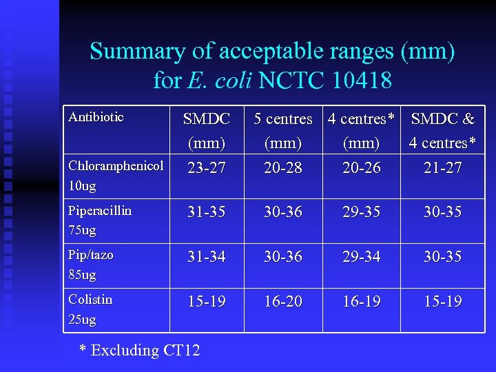 Summary of acceptable ranges (mm) for E. coli NCTC 10418 Antibiotic Chloramphenicol 10 ug SMDC (mm) 23 -27 5 centres 4 centres* SMDC & (mm) 4 centres* 20 -28 20 -26 21 -27 Piperacillin 75 ug 31 -35 30 -36 29 -35 30 -35 Pip/tazo 85 ug 31 -34 30 -36 29 -34 30 -35 Colistin 25 ug 15 -19 16 -20 16 -19 15 -19 * Excluding CT 12
