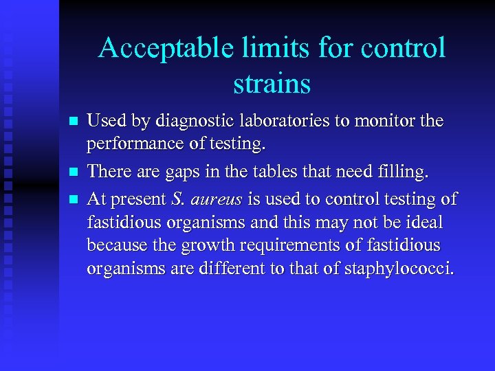 Acceptable limits for control strains n n n Used by diagnostic laboratories to monitor the performance of testing. There are gaps in the tables that need filling. At present S. aureus is used to control testing of fastidious organisms and this may not be ideal because the growth requirements of fastidious organisms are different to that of staphylococci.