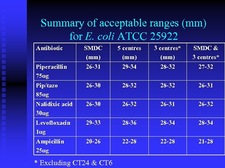Summary of acceptable ranges (mm) for E. coli ATCC 25922 Antibiotic SMDC (mm) 5 centres (mm) 3 centres* (mm) SMDC & 3 centres* Piperacillin 75 ug 26 -31 29 -34 28 -32 27 -32 Pip/tazo 85 ug 26 -30 28 -32 26 -31 Nalidixic acid 30 ug 26 -30 26 -32 26 -31 26 -32 Levofloxacin 1 ug 29 -33 28 -36 28 -34 Ampicillin 25 ug 20 -26 22 -28 21 -28 * Excluding CT 24 & CT 6