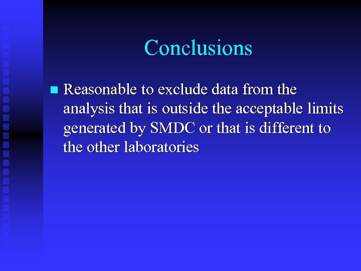 Conclusions n Reasonable to exclude data from the analysis that is outside the acceptable limits generated by SMDC or that is different to the other laboratories