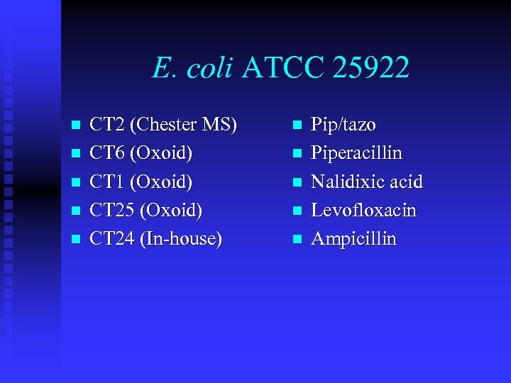 E. coli ATCC 25922 n n n CT 2 (Chester MS) CT 6 (Oxoid) CT 1 (Oxoid) CT 25 (Oxoid) CT 24 (In-house) n n n Pip/tazo Piperacillin Nalidixic acid Levofloxacin Ampicillin