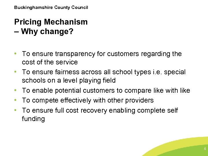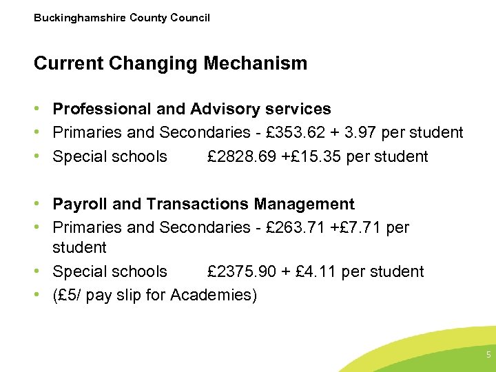 Buckinghamshire County Council Pricing Mechanism – Why change? • To ensure transparency for customers regarding the cost of the service • To ensure fairness across all school types i. e. special schools on a level playing field • To enable potential customers to compare like with like • To compete effectively with other providers • To ensure full cost recovery enabling complete self funding 4