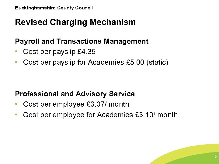 Buckinghamshire County Council Current Changing Mechanism • Professional and Advisory services • Primaries and Secondaries - £ 353. 62 + 3. 97 per student • Special schools £ 2828. 69 +£ 15. 35 per student • Payroll and Transactions Management • Primaries and Secondaries - £ 263. 71 +£ 7. 71 per student • Special schools £ 2375. 90 + £ 4. 11 per student • (£ 5/ pay slip for Academies) 5