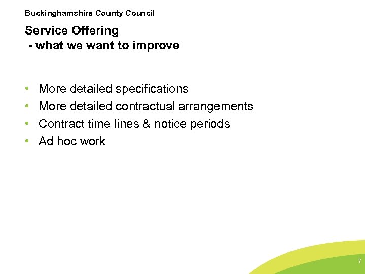Buckinghamshire County Council Service Offering - what we want to improve • • More detailed specifications More detailed contractual arrangements Contract time lines & notice periods Ad hoc work 7