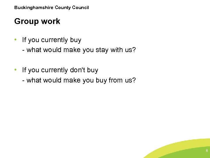 Buckinghamshire County Council Group work • If you currently buy - what would make you stay with us? • If you currently don't buy - what would make you buy from us? 8
