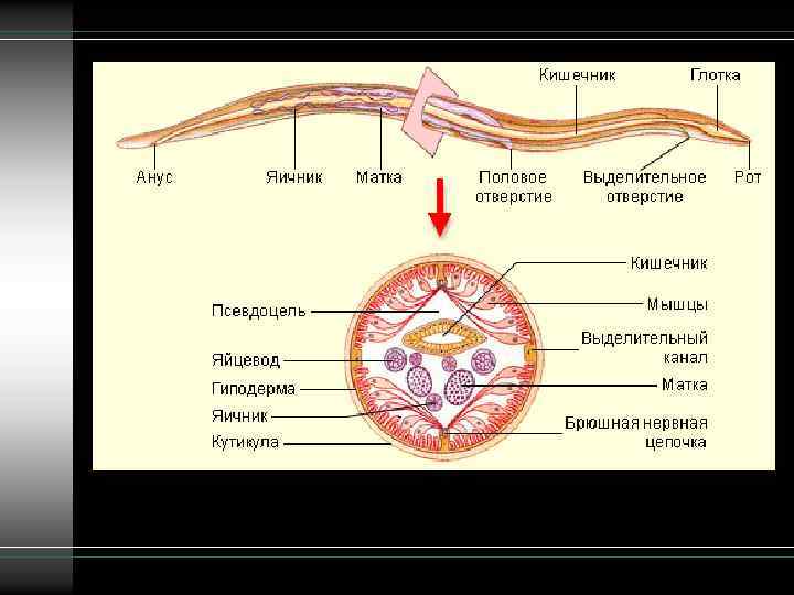• • • Травна система представлена прямою трубкою і закінчується анальним отвором. Передня кишка має м’язову глотку, а середня складається тільки з ентодермальних клітин, а м'язових клітин немає Нервова система складається з поздовжніх тяжів. Для круглих червів характерна слабкий ступінь цефалізаціі Кровоносна система відсутня Дихання або через шкіру, або анаеробне Видільна система у вигляді протонефридій, але без клітин з війковим полум'ям Роздільностатеві. розвиток прямий