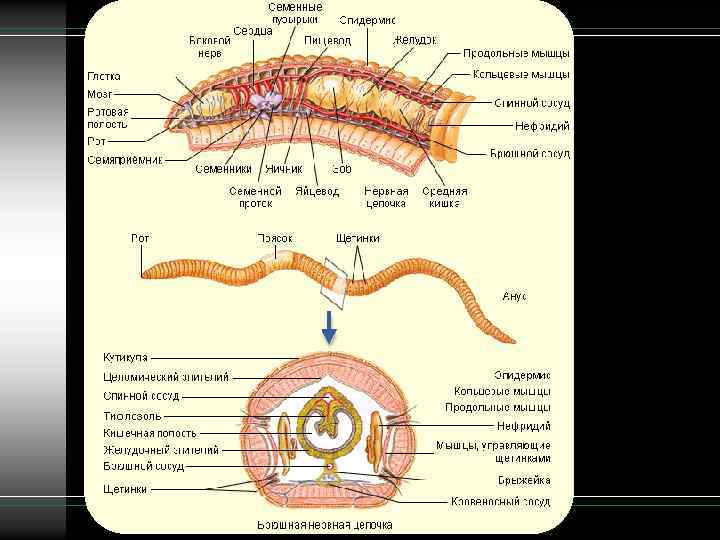 • • Вперше у складі травного тракту з'являються м'язові клітини Стінка тіла м’язова, часто з суцільними шарами кільцевих м'язів і чотирма смугами поздовжніх м'язів Нервова система з надстравохідним ганглієм, навколостравохідним кільцем і черевним нервовим стовбуром Вперше видільна система представлена метанефридіями Епітелій вкритий кутикулою і несе епідермальні щетинки Вперше з'являються примітивні органи руху У морських форм личинкова стадія