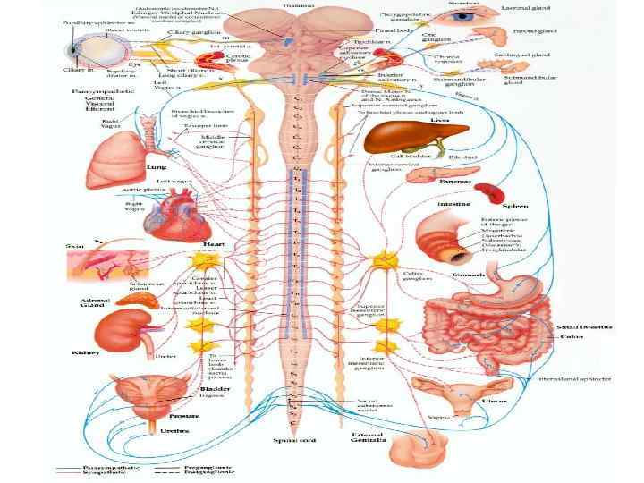 Будова АНС • Симпатичний відділ. • Тіла довузлових нейронів в грудинно-поперековому (T 112, L 1, 2) відділі спинного мозку. • Тіла післявузлових нейронів у вузлах симпатичного стовбуру і проміжних вузлах. • Парасимпатичний відділ. • Тіла довузлових нейронів в середньому (3) і довгастому (7, 9, 10 ЧМН) мозку + крижовий відділ спинного (S 2 -S 4). • Тіла післявузлових нейронів у внутрішньоорганних вузлах.