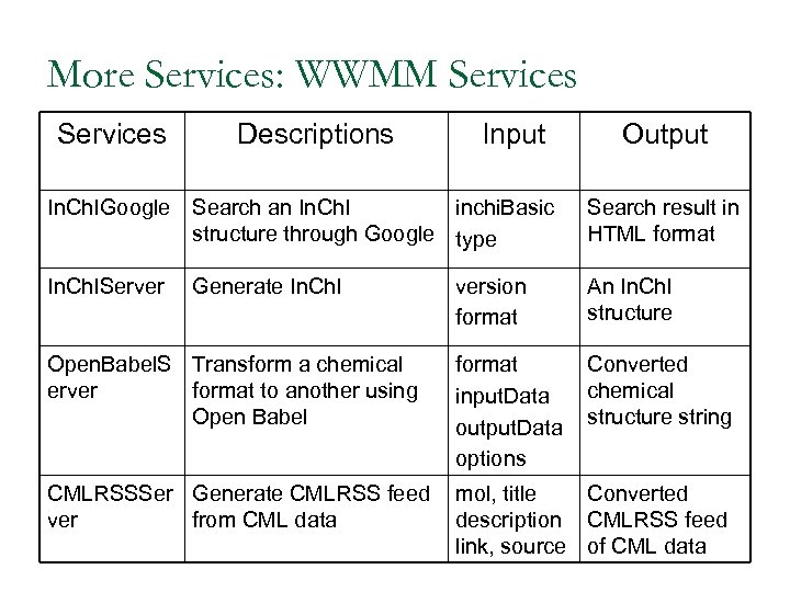 More Services: WWMM Services Descriptions Input Output In. Ch. IGoogle Search an In. Ch. I inchi. Basic structure through Google type Search result in HTML format In. Ch. IServer version format An In. Ch. I structure Open. Babel. S Transform a chemical erver format to another using Open Babel format input. Data output. Data options Converted chemical structure string CMLRSSSer Generate CMLRSS feed ver from CML data mol, title Converted description CMLRSS feed link, source of CML data Generate In. Ch. I