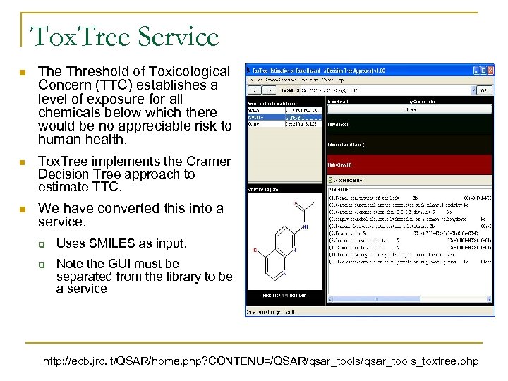 Tox. Tree Service n The Threshold of Toxicological Concern (TTC) establishes a level of exposure for all chemicals below which there would be no appreciable risk to human health. n Tox. Tree implements the Cramer Decision Tree approach to estimate TTC. n We have converted this into a service. q q Uses SMILES as input. Note the GUI must be separated from the library to be a service http: //ecb. jrc. it/QSAR/home. php? CONTENU=/QSAR/qsar_tools_toxtree. php