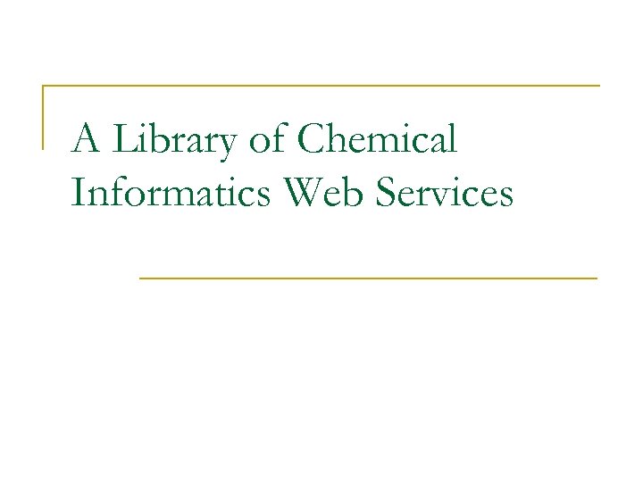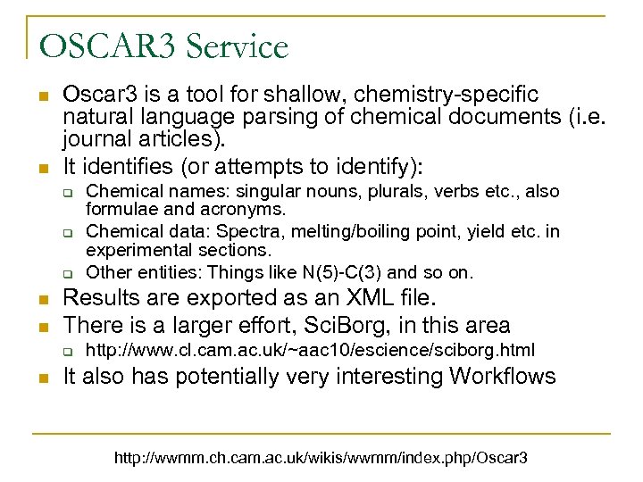 OSCAR 3 Service n n Oscar 3 is a tool for shallow, chemistry-specific natural language parsing of chemical documents (i. e. journal articles). It identifies (or attempts to identify): q q q n n Results are exported as an XML file. There is a larger effort, Sci. Borg, in this area q n Chemical names: singular nouns, plurals, verbs etc. , also formulae and acronyms. Chemical data: Spectra, melting/boiling point, yield etc. in experimental sections. Other entities: Things like N(5)-C(3) and so on. http: //www. cl. cam. ac. uk/~aac 10/escience/sciborg. html It also has potentially very interesting Workflows http: //wwmm. ch. cam. ac. uk/wikis/wwmm/index. php/Oscar 3