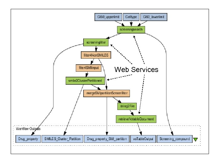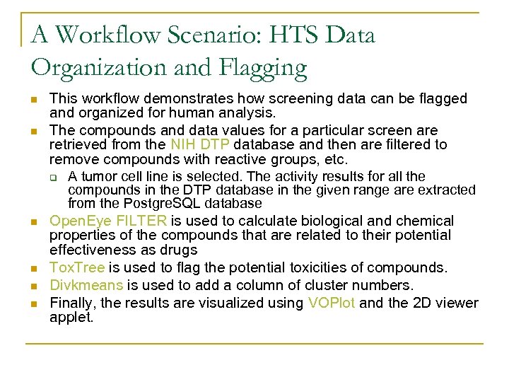 A Workflow Scenario: HTS Data Organization and Flagging n n n This workflow demonstrates how screening data can be flagged and organized for human analysis. The compounds and data values for a particular screen are retrieved from the NIH DTP database and then are filtered to remove compounds with reactive groups, etc. q A tumor cell line is selected. The activity results for all the compounds in the DTP database in the given range are extracted from the Postgre. SQL database Open. Eye FILTER is used to calculate biological and chemical properties of the compounds that are related to their potential effectiveness as drugs Tox. Tree is used to flag the potential toxicities of compounds. Divkmeans is used to add a column of cluster numbers. Finally, the results are visualized using VOPlot and the 2 D viewer applet.