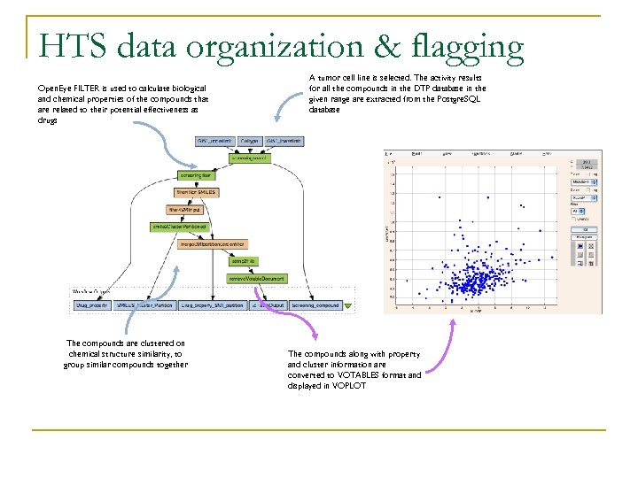 HTS data organization & flagging Open. Eye FILTER is used to calculate biological and chemical properties of the compounds that are related to their potential effectiveness as drugs The compounds are clustered on chemical structure similarity, to group similar compounds together A tumor cell line is selected. The activity results for all the compounds in the DTP database in the given range are extracted from the Postgre. SQL database The compounds along with property and cluster information are converted to VOTABLES format and displayed in VOPLOT