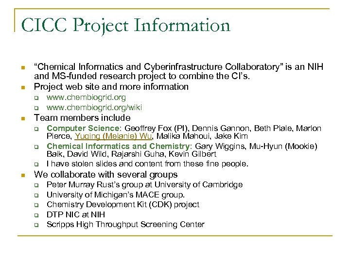 CICC Project Information n n “Chemical Informatics and Cyberinfrastructure Collaboratory” is an NIH and MS-funded research project to combine the CI’s. Project web site and more information q q n Team members include q q q n www. chembiogrid. org/wiki Computer Science: Geoffrey Fox (PI), Dennis Gannon, Beth Plale, Marlon Pierce, Yuqing (Melanie) Wu, Malika Mahoui, Jake Kim Chemical Informatics and Chemistry: Gary Wiggins, Mu-Hyun (Mookie) Baik, David Wild, Rajarshi Guha, Kevin Gilbert I have stolen slides and content from these fine people. We collaborate with several groups q q q Peter Murray Rust’s group at University of Cambridge University of Michigan’s MACE group. Chemistry Development Kit (CDK) project DTP NIC at NIH Scripps High Throughput Screening Center