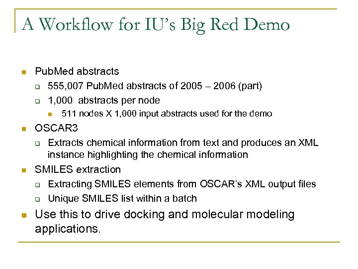 A Workflow for IU’s Big Red Demo n Pub. Med abstracts q 555, 007 Pub. Med abstracts of 2005 – 2006 (part) q 1, 000 abstracts per node n n 511 nodes X 1, 000 input abstracts used for the demo OSCAR 3 q Extracts chemical information from text and produces an XML instance highlighting the chemical information SMILES extraction q Extracting SMILES elements from OSCAR’s XML output files q Unique SMILES list within a batch Use this to drive docking and molecular modeling applications.
