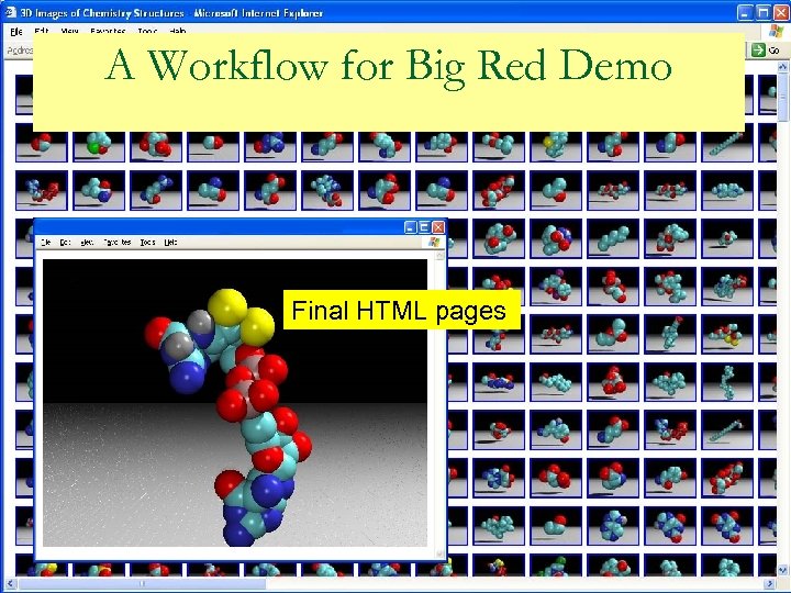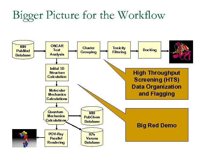 Bigger Picture for the Workflow NIH Pub. Med Database OSCAR Text Analysis Cluster Grouping Initial 3 D Structure Calculation Toxicity Filtering Docking High Throughput Screening (HTS) Data Organization and Flagging Molecular Mechanics Calculations Quantum Mechanics Calculations NIH Pub. Chem Database POV-Ray Parallel Rendering IU’s Varuna Database Big Red Demo