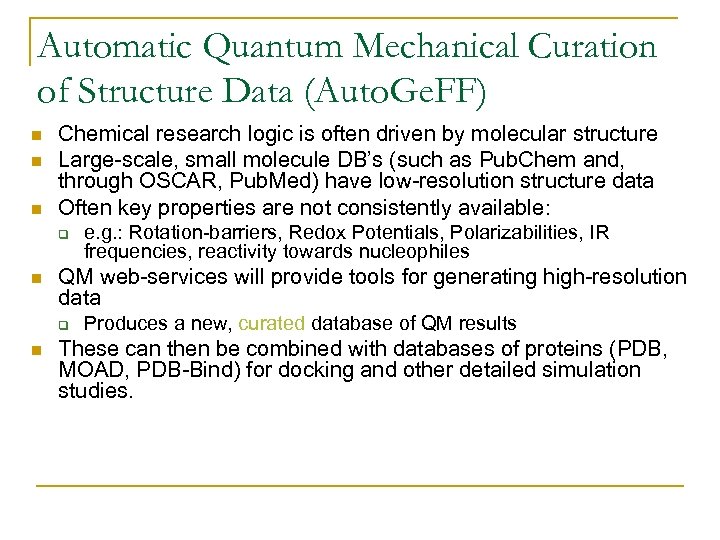 Automatic Quantum Mechanical Curation of Structure Data (Auto. Ge. FF) n n n Chemical research logic is often driven by molecular structure Large-scale, small molecule DB’s (such as Pub. Chem and, through OSCAR, Pub. Med) have low-resolution structure data Often key properties are not consistently available: q n QM web-services will provide tools for generating high-resolution data q n e. g. : Rotation-barriers, Redox Potentials, Polarizabilities, IR frequencies, reactivity towards nucleophiles Produces a new, curated database of QM results These can then be combined with databases of proteins (PDB, MOAD, PDB-Bind) for docking and other detailed simulation studies.