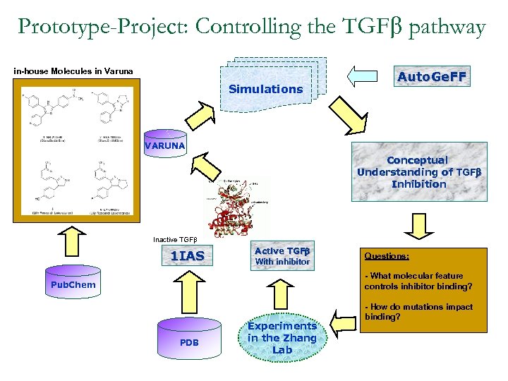 Prototype-Project: Controlling the TGFb pathway in-house Molecules in Varuna Simulations Auto. Ge. FF VARUNA Conceptual Understanding of TGFb Inhibition Inactive TGFb 1 IAS Active TGFb With inhibitor Questions: - What molecular feature controls inhibitor binding? Pub. Chem PDB Experiments in the Zhang Lab - How do mutations impact binding?