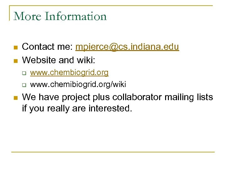 More Information n n Contact me: mpierce@cs. indiana. edu Website and wiki: q q n www. chembiogrid. org www. chemibiogrid. org/wiki We have project plus collaborator mailing lists if you really are interested.