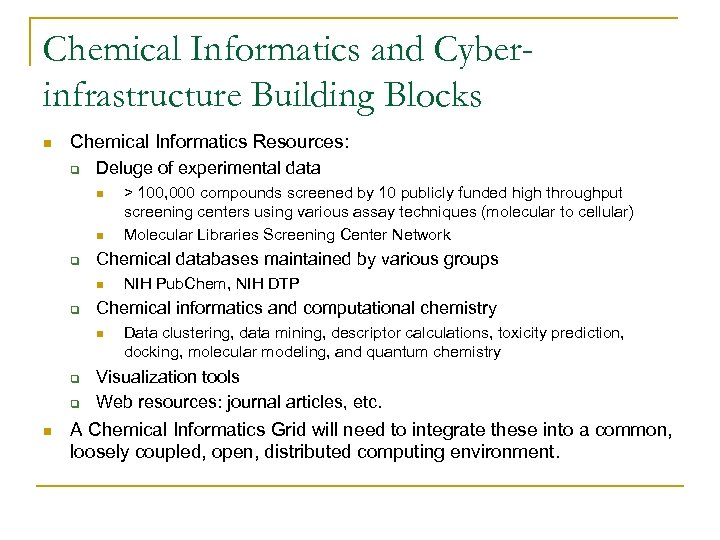 Chemical Informatics and Cyberinfrastructure Building Blocks n Chemical Informatics Resources: q Deluge of experimental data n n q Chemical databases maintained by various groups n q q n NIH Pub. Chem, NIH DTP Chemical informatics and computational chemistry n q > 100, 000 compounds screened by 10 publicly funded high throughput screening centers using various assay techniques (molecular to cellular) Molecular Libraries Screening Center Network Data clustering, data mining, descriptor calculations, toxicity prediction, docking, molecular modeling, and quantum chemistry Visualization tools Web resources: journal articles, etc. A Chemical Informatics Grid will need to integrate these into a common, loosely coupled, open, distributed computing environment.