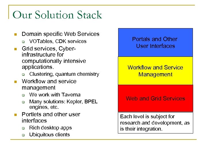 Our Solution Stack n Domain specific Web Services q n Grid services, Cyberinfrastructure for computationally intensive applications. q n Clustering, quantum chemistry Portals and Other User Interfaces Workflow and Service Management Workflow and service management q q n VOTables, CDK services We work with Taverna Many solutions: Kepler, BPEL engines, etc. Portlets and other user interfaces q q Rich desktop apps Ubiquitous clients Web and Grid Services Each level is subject for research and development, as is their integration.