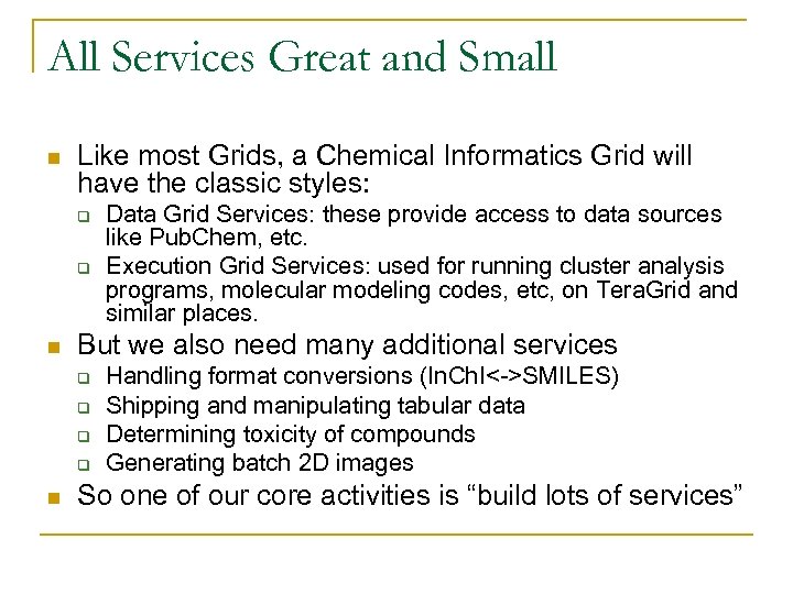 All Services Great and Small n Like most Grids, a Chemical Informatics Grid will have the classic styles: q q n But we also need many additional services q q n Data Grid Services: these provide access to data sources like Pub. Chem, etc. Execution Grid Services: used for running cluster analysis programs, molecular modeling codes, etc, on Tera. Grid and similar places. Handling format conversions (In. Ch. I<->SMILES) Shipping and manipulating tabular data Determining toxicity of compounds Generating batch 2 D images So one of our core activities is “build lots of services”