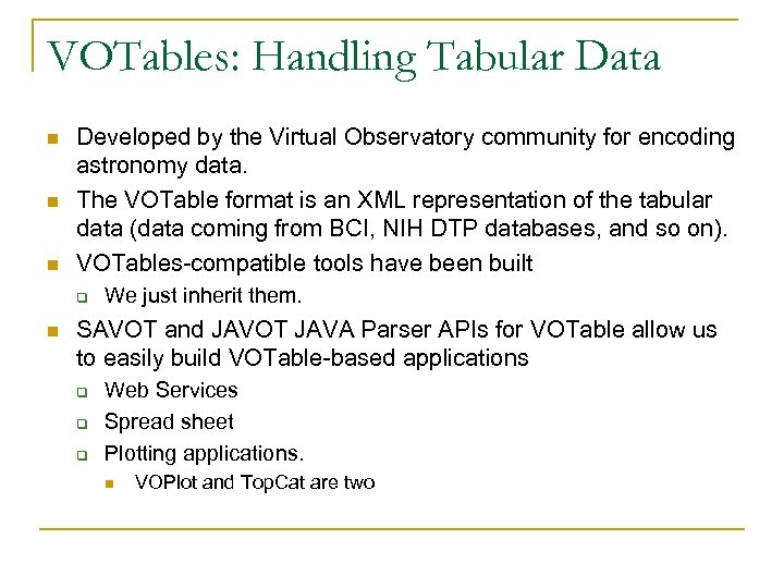 VOTables: Handling Tabular Data n n n Developed by the Virtual Observatory community for encoding astronomy data. The VOTable format is an XML representation of the tabular data (data coming from BCI, NIH DTP databases, and so on). VOTables-compatible tools have been built q n We just inherit them. SAVOT and JAVOT JAVA Parser APIs for VOTable allow us to easily build VOTable-based applications q q q Web Services Spread sheet Plotting applications. n VOPlot and Top. Cat are two