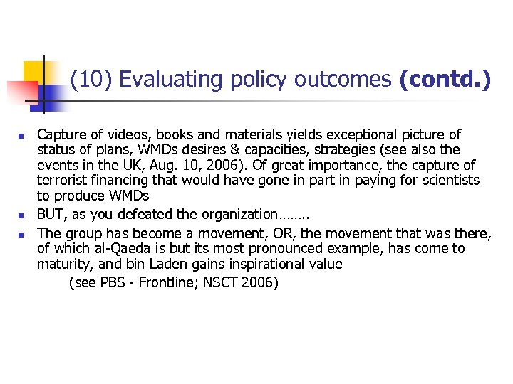 (10) Evaluating policy outcomes (contd. ) n n n Capture of videos, books and materials yields exceptional picture of status of plans, WMDs desires & capacities, strategies (see also the events in the UK, Aug. 10, 2006). Of great importance, the capture of terrorist financing that would have gone in part in paying for scientists to produce WMDs BUT, as you defeated the organization……. . The group has become a movement, OR, the movement that was there, of which al-Qaeda is but its most pronounced example, has come to maturity, and bin Laden gains inspirational value (see PBS - Frontline; NSCT 2006)