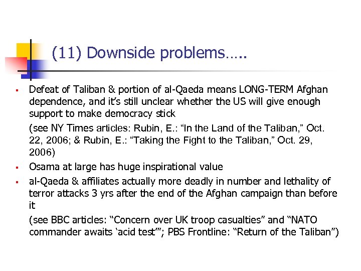 (11) Downside problems…. . § § § Defeat of Taliban & portion of al-Qaeda means LONG-TERM Afghan dependence, and it’s still unclear whether the US will give enough support to make democracy stick (see NY Times articles: Rubin, E. : “In the Land of the Taliban, ” Oct. 22, 2006; & Rubin, E. : “Taking the Fight to the Taliban, ” Oct. 29, 2006) Osama at large has huge inspirational value al-Qaeda & affiliates actually more deadly in number and lethality of terror attacks 3 yrs after the end of the Afghan campaign than before it (see BBC articles: “Concern over UK troop casualties” and “NATO commander awaits ‘acid test’”; PBS Frontline: “Return of the Taliban”)