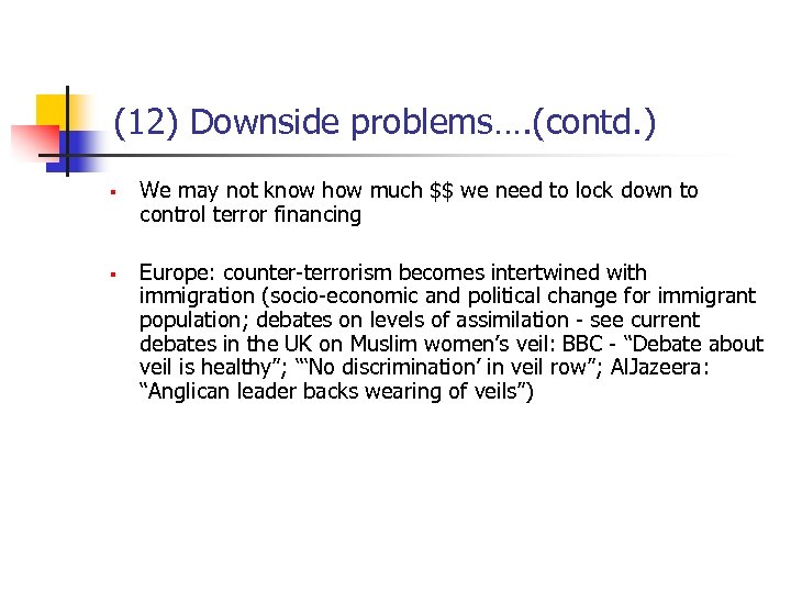 (12) Downside problems…. (contd. ) § § We may not know how much $$ we need to lock down to control terror financing Europe: counter-terrorism becomes intertwined with immigration (socio-economic and political change for immigrant population; debates on levels of assimilation - see current debates in the UK on Muslim women’s veil: BBC - “Debate about veil is healthy”; “‘No discrimination’ in veil row”; Al. Jazeera: “Anglican leader backs wearing of veils”)