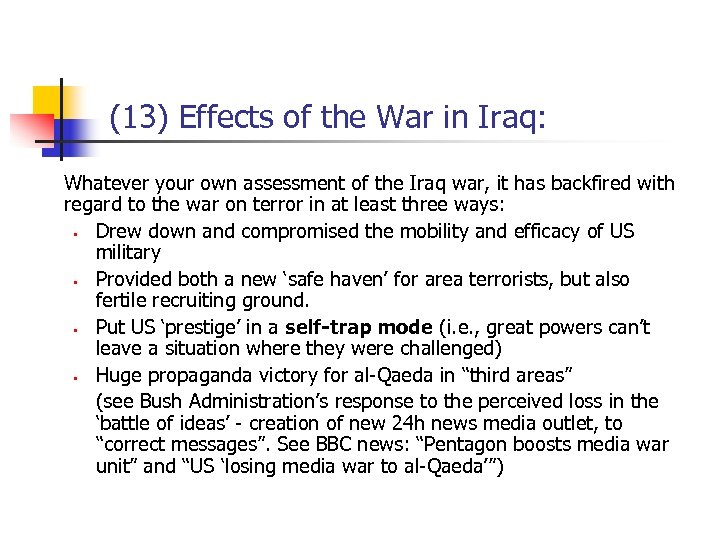 (13) Effects of the War in Iraq: Whatever your own assessment of the Iraq war, it has backfired with regard to the war on terror in at least three ways: § Drew down and compromised the mobility and efficacy of US military § Provided both a new ‘safe haven’ for area terrorists, but also fertile recruiting ground. § Put US ‘prestige’ in a self-trap mode (i. e. , great powers can’t leave a situation where they were challenged) § Huge propaganda victory for al-Qaeda in “third areas” (see Bush Administration’s response to the perceived loss in the ‘battle of ideas’ - creation of new 24 h news media outlet, to “correct messages”. See BBC news: “Pentagon boosts media war unit” and “US ‘losing media war to al-Qaeda’”)