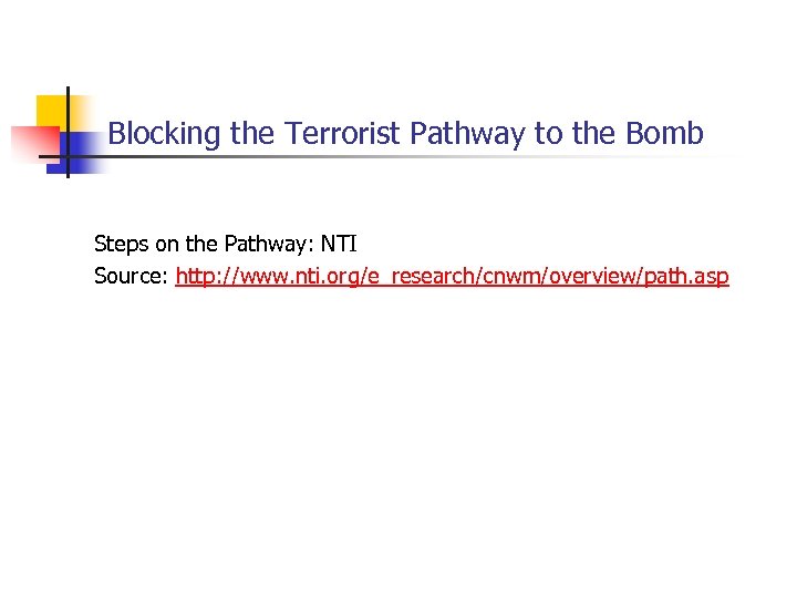 Blocking the Terrorist Pathway to the Bomb Steps on the Pathway: NTI Source: http: //www. nti. org/e_research/cnwm/overview/path. asp