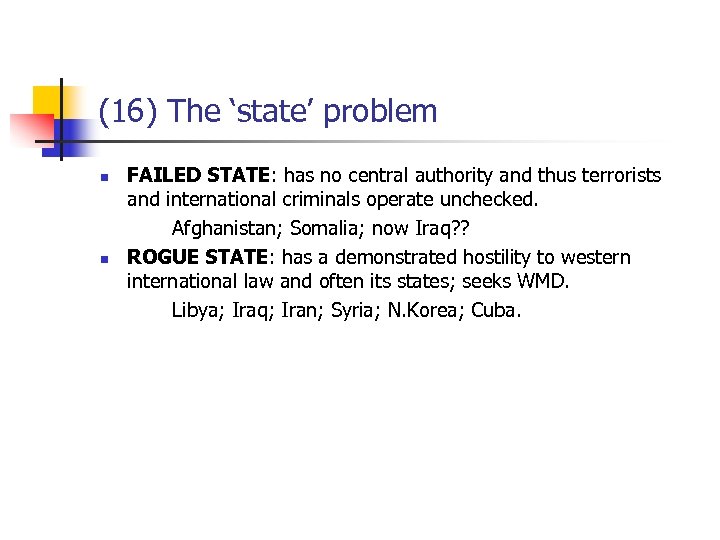 (16) The ‘state’ problem n n FAILED STATE: has no central authority and thus terrorists and international criminals operate unchecked. Afghanistan; Somalia; now Iraq? ? ROGUE STATE: has a demonstrated hostility to western international law and often its states; seeks WMD. Libya; Iraq; Iran; Syria; N. Korea; Cuba.