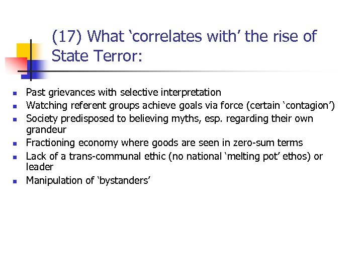 (17) What ‘correlates with’ the rise of State Terror: n n n Past grievances with selective interpretation Watching referent groups achieve goals via force (certain ‘contagion’) Society predisposed to believing myths, esp. regarding their own grandeur Fractioning economy where goods are seen in zero-sum terms Lack of a trans-communal ethic (no national ‘melting pot’ ethos) or leader Manipulation of ‘bystanders’