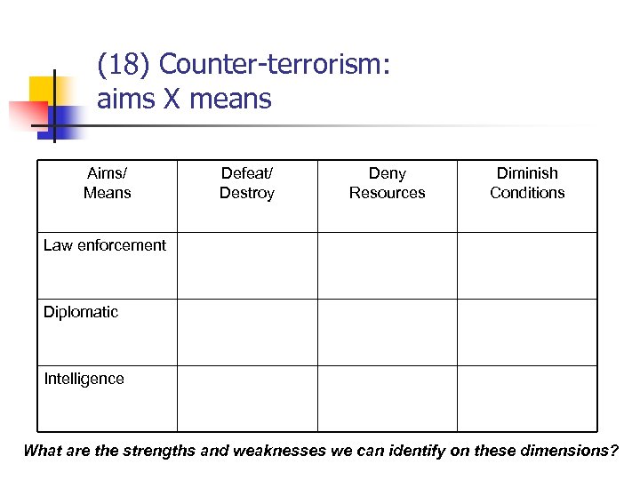 (18) Counter-terrorism: aims X means Aims/ Means Defeat/ Destroy Deny Resources Diminish Conditions Law enforcement Diplomatic Intelligence What are the strengths and weaknesses we can identify on these dimensions?