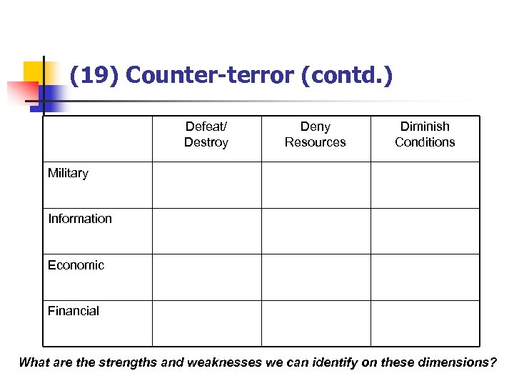 (19) Counter-terror (contd. ) Defeat/ Destroy Deny Resources Diminish Conditions Military Information Economic Financial What are the strengths and weaknesses we can identify on these dimensions?