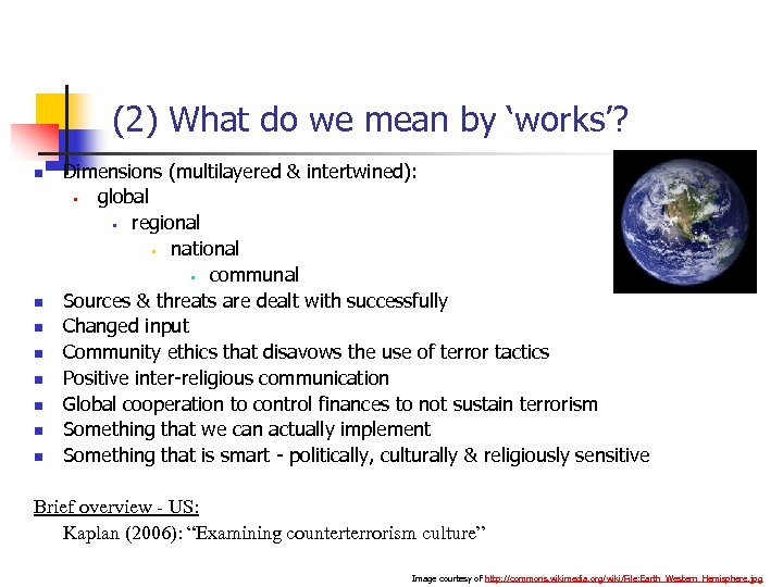 (2) What do we mean by ‘works’? n n n n Dimensions (multilayered & intertwined): § global § regional § national § communal Sources & threats are dealt with successfully Changed input Community ethics that disavows the use of terror tactics Positive inter-religious communication Global cooperation to control finances to not sustain terrorism Something that we can actually implement Something that is smart - politically, culturally & religiously sensitive Brief overview - US: Kaplan (2006): “Examining counterterrorism culture” Image courtesy of http: //commons. wikimedia. org/wiki/File: Earth_Western_Hemisphere. jpg