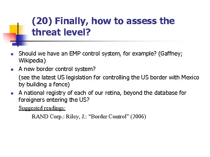 (20) Finally, how to assess the threat level? n n n Should we have an EMP control system, for example? (Gaffney; Wikipedia) A new border control system? (see the latest US legislation for controlling the US border with Mexico by building a fence) A national registry of each of our retina, beyond the database foreigners entering the US? Suggested readings: RAND Corp. : Riley, J. : “Border Control” (2006)