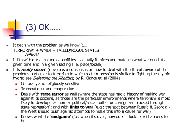 (3) OK…. . n It deals with the problem as we know it…. . TERRORISM + WMDs + FAILED/ROGUE STATES = THREAT n n It fits with our aims and capabilities… actually it mixes and matches what we need at a given time and in a given setting (i. e. place/locale) It is really smart: (develops a consensus on how to deal with the threat, aware of the problems particular to terrorism in which state repression is similar to fighting the mythic hydra; see Defeating the Jihadists, by R. Clarke et. al (2004) n Culturally and religiously sensitive n Transnational and cooperative n Deals with state terror as well (where the state has had a history of making war against its citizens, as those are the particular environments where terrorism is most likely to develop - as normal political/social paths for change are blocked through state repression); and with links to war (e. g. : the spat between Russia & Georgia the West should push against attempts to make this into a cause for war) n Knows what the ‘endgame’ (i. e. when it’s over, how does it look like? ) happens to be