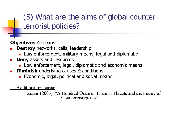 (5) What are the aims of global counterterrorist policies? Objectives & means: n Destroy networks, cells, leadership n Law enforcement, military means, legal and diplomatic n Deny assets and resources n Law enforcement, legal, diplomatic and economic means n Diminish underlying causes & conditions n Economic, legal, political and social means Additional resource: Zuhur (2005): “A Hundred Osamas: Islamist Threats and the Future of Counterinsurgency”