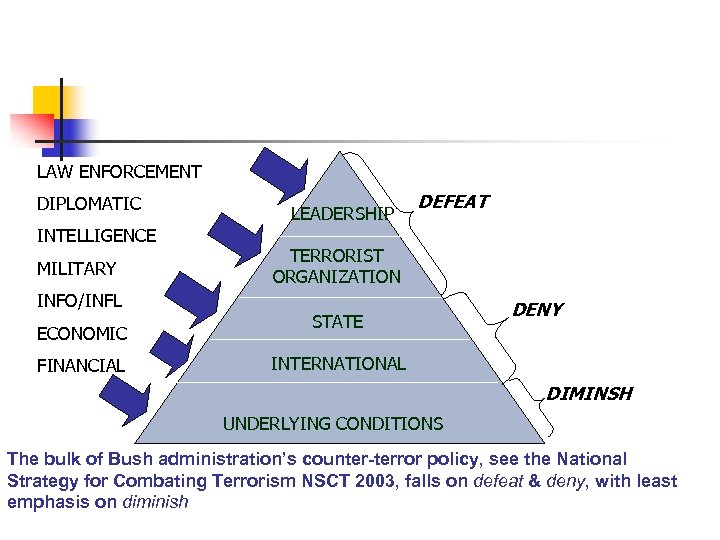 LAW ENFORCEMENT DIPLOMATIC INTELLIGENCE MILITARY INFO/INFL ECONOMIC FINANCIAL LEADERSHIP DEFEAT TERRORIST ORGANIZATION STATE DENY INTERNATIONAL DIMINSH UNDERLYING CONDITIONS The bulk of Bush administration’s counter-terror policy, see the National Strategy for Combating Terrorism NSCT 2003, falls on defeat & deny, with least emphasis on diminish