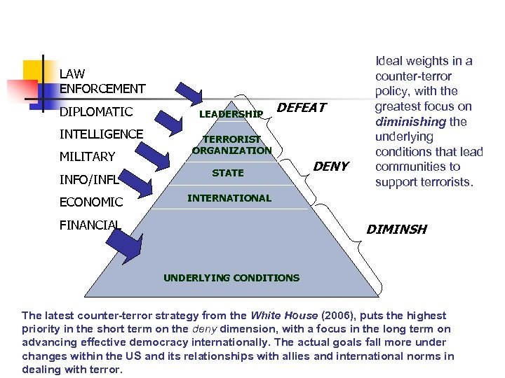 LAW ENFORCEMENT DIPLOMATIC INTELLIGENCE MILITARY INFO/INFL ECONOMIC LEADERSHIP DEFEAT TERRORIST ORGANIZATION STATE DENY Ideal weights in a counter-terror policy, with the greatest focus on diminishing the underlying conditions that lead communities to support terrorists. INTERNATIONAL FINANCIAL DIMINSH UNDERLYING CONDITIONS The latest counter-terror strategy from the White House (2006), puts the highest priority in the short term on the deny dimension, with a focus in the long term on advancing effective democracy internationally. The actual goals fall more under changes within the US and its relationships with allies and international norms in dealing with terror.