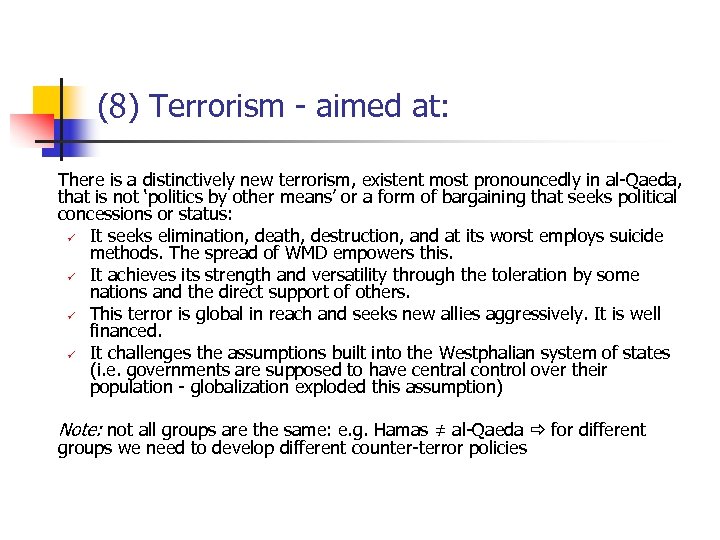 (8) Terrorism - aimed at: There is a distinctively new terrorism, existent most pronouncedly in al-Qaeda, that is not ‘politics by other means’ or a form of bargaining that seeks political concessions or status: ü It seeks elimination, death, destruction, and at its worst employs suicide methods. The spread of WMD empowers this. ü It achieves its strength and versatility through the toleration by some nations and the direct support of others. ü This terror is global in reach and seeks new allies aggressively. It is well financed. ü It challenges the assumptions built into the Westphalian system of states (i. e. governments are supposed to have central control over their population - globalization exploded this assumption) Note: not all groups are the same: e. g. Hamas ≠ al-Qaeda for different groups we need to develop different counter-terror policies