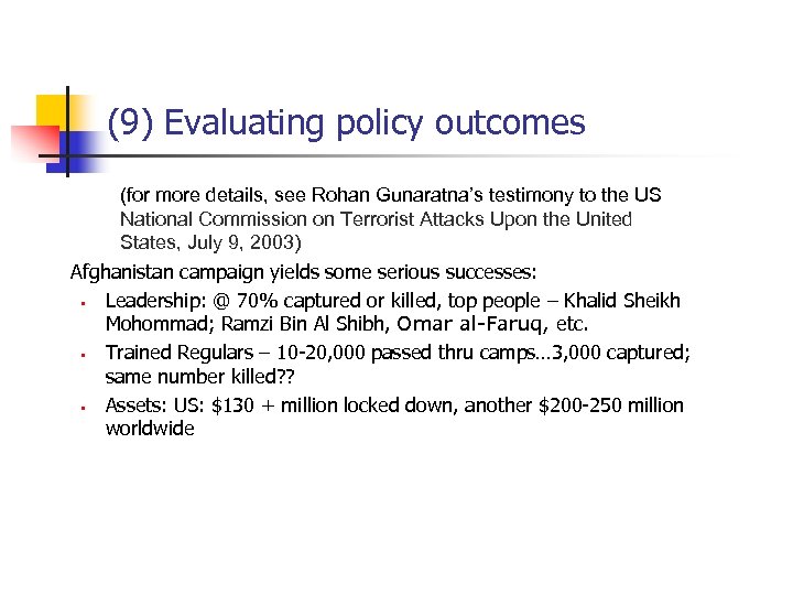 (9) Evaluating policy outcomes (for more details, see Rohan Gunaratna’s testimony to the US National Commission on Terrorist Attacks Upon the United States, July 9, 2003) Afghanistan campaign yields some serious successes: § Leadership: @ 70% captured or killed, top people – Khalid Sheikh Mohommad; Ramzi Bin Al Shibh, Omar al-Faruq, etc. § Trained Regulars – 10 -20, 000 passed thru camps… 3, 000 captured; same number killed? ? § Assets: US: $130 + million locked down, another $200 -250 million worldwide