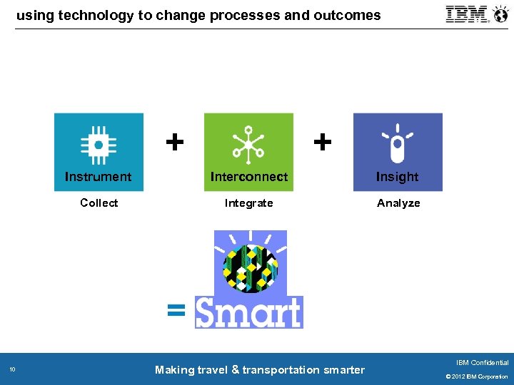 Era of Smart …. Innovative technologies enabling cities to transform there systems, infrastructure and citizen services • Extensive broadband, wireless and mobile adoption • New connectivity demands of workers, citizens and customers 24/7 any place e. g. smart work hubs & connected homes • New wave of intelligent systems for industry and cities including M 2 M, robotics and RFID • Engaging and Understanding empowered citizens through social media • Big Data & Predictive Analytics is changing decision making • Cloud models are changing the economics and scaleability of citizen services • Embracing the Digital era 9 9 Making travel & transportation smarter IBM Confidential © 2011 IBM Corporation © 2012 IBM Corporation