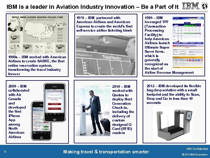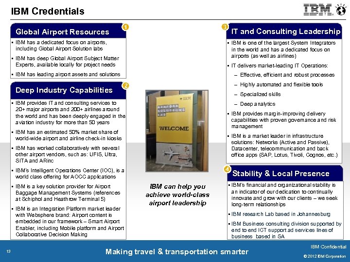 IBM is a leader in Aviation Industry Innovation – Be a Part of It 1970 – IBM partnered with American Airlines and American Express to create the world’s first self-service airline ticketing kiosk 1960 s – IBM worked with American Airlines to create SABRE, the first online reservation system, transforming the travel industry forever 2009 – IBM collaborated with Air Canada and developed the first i. Phone App among North American Airlines 12 2010 – IBM worked with Qantas to deploy Next Generation Check-in, including the delivery of custom designed Q Card (RFID) readers 1985 – IBM leveraged TPF (Transaction Processing Facility) to help American Airlines launch Ultimate Super Saver fares, which is generally recognized as the start of Airline Revenue Management 2012 – IBM developed its flexible bag drop solution with a small footprint and the ability to Scan, Drop and Go in less than 10 seconds Making travel & transportation smarter IBM Confidential © 2011 IBM Corporation © 2012 IBM Corporation