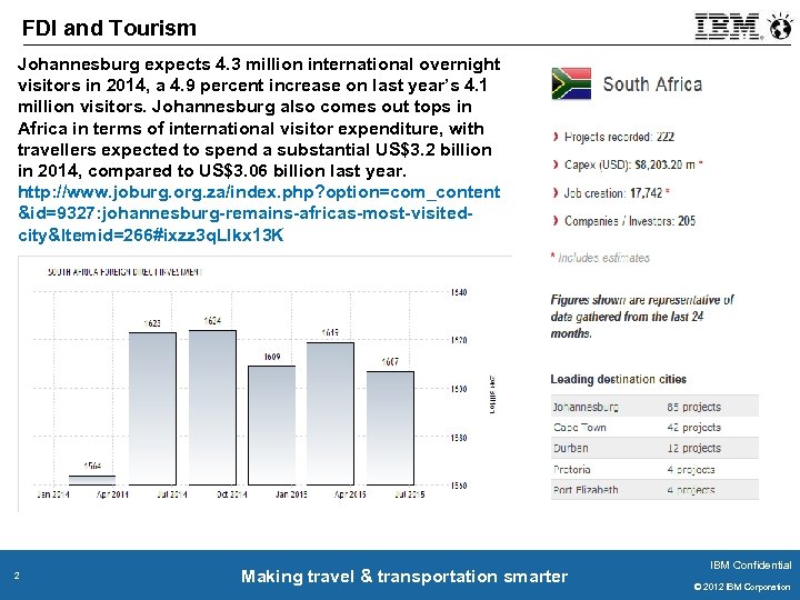 FDI and Tourism Johannesburg expects 4. 3 million international overnight visitors in 2014, a 4. 9 percent increase on last year’s 4. 1 million visitors. Johannesburg also comes out tops in Africa in terms of international visitor expenditure, with travellers expected to spend a substantial US$3. 2 billion in 2014, compared to US$3. 06 billion last year. http: //www. joburg. org. za/index. php? option=com_content &id=9327: johannesburg-remains-africas-most-visitedcity&Itemid=266#ixzz 3 q. Llkx 13 K 2 Making travel & transportation smarter IBM Confidential © 2011 IBM Corporation © 2012 IBM Corporation
