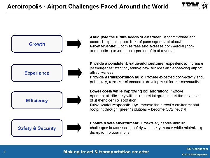 Aerotropolis - Airport Challenges Faced Around the World Growth Experience Anticipate the future needs of air travel: Accommodate and connect expanding numbers of passengers and aircraft Grow revenue: Optimize fees and increase commercial (nonaeronautical) revenue as a portion of total revenue Provide a consistent, value-add customer experience: Increase passenger satisfaction, adding new services and enhancing airport attractiveness Provide a transportation hub: Provide expected connectivity and, potentially, a source of economic development for the community Efficiency Safety & Security 3 Lower costs while improving collaboration: Improve operational efficiency with increased integration and the next level of stakeholder collaboration Drive social responsibility: Improve the airport’s environmental footprint through “green” solutions – become CO 2 neutral Ensure a safe environment: Proactively handle difficult challenges in addressing safety & security threats while minimizing disruption to operations Making travel & transportation smarter IBM Confidential © 2011 IBM Corporation © 2012 IBM Corporation