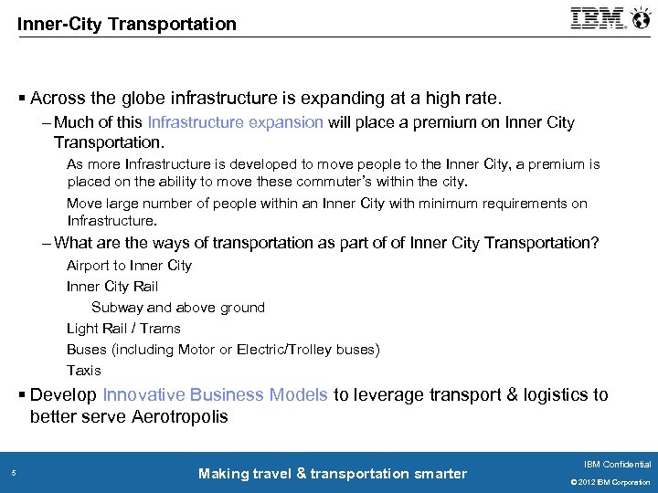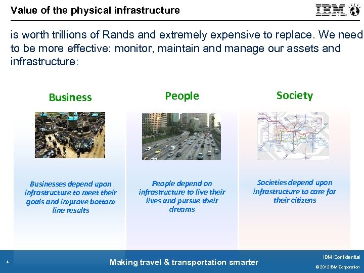 Value of the physical infrastructure is worth trillions of Rands and extremely expensive to replace. We need to be more effective: monitor, maintain and manage our assets and infrastructure: Business Society Businesses depend upon infrastructure to meet their goals and improve bottom line results 4 People depend on infrastructure to live their lives and pursue their dreams Societies depend upon infrastructure to care for their citizens Making travel & transportation smarter IBM Confidential © 2011 IBM Corporation © 2012 IBM Corporation